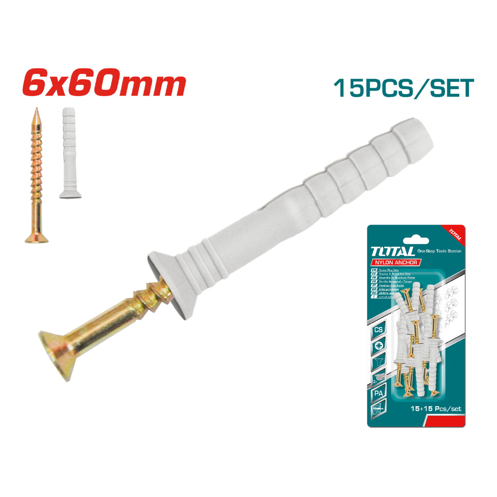 (15 unidades) Juego de Tacos de anclaje Taco de nilón, 6x60mm, Tornillo Estrella cabeza cónica (Pozi drive). Blíster.