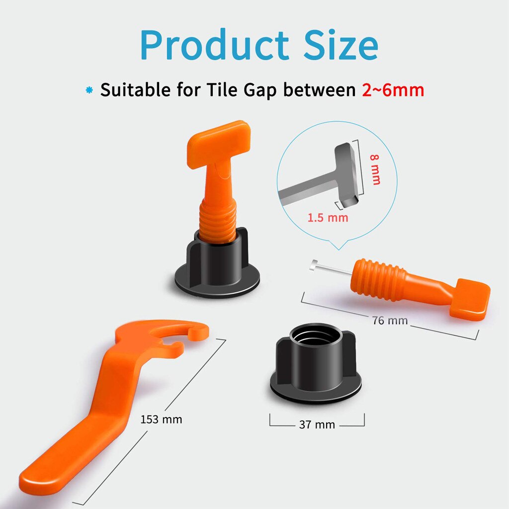 | Características | El sistema de nivelación garantiza la completa planitud entre las baldosas. Rápido y suave, fácil de girar.Pines en T reutilizables, el espacio para azulejos es de 0.059 pulg |