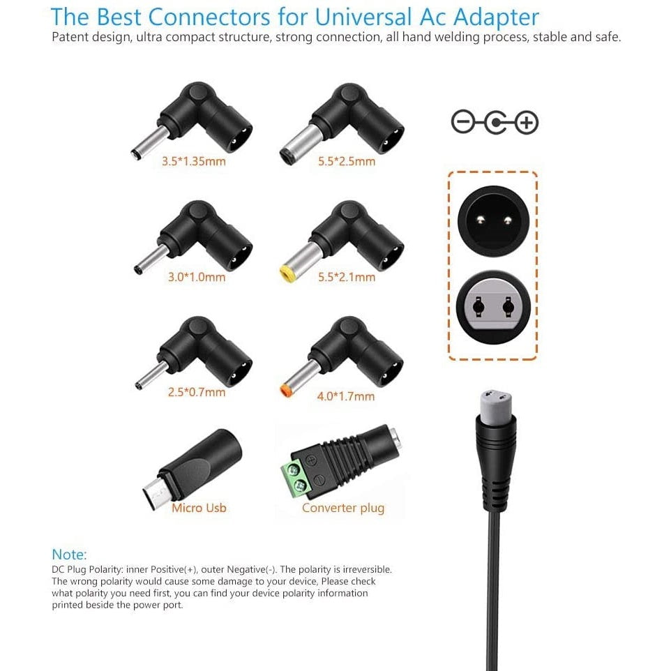 Esta fuente de alimentación tiene 8 enchufes o boquillas de diferentes tamaños que se ajustan bien a tus aparatos eléctricos y resuelven tus problemas de conexión.