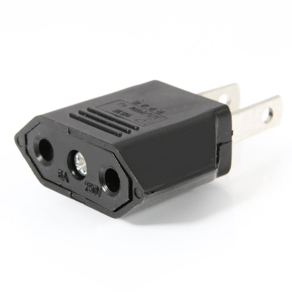Adaptador Sencillo Sistema Europeo a Americano sin Tierra. Nema 1-15P. 6A-220Volt. 60Hz. Material Plastico Rigido + Metal. Color Nergo. Empaque en Bolsa Plastica Color con Codigo Barra