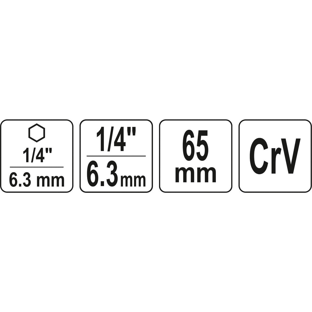 1/4'', HEXADECIMAL, MATERIAL: CRV, LONGITUD: 65MM, ACABADO NEGRO; IMPRESIÓN DE LOGOTIPO LÁSER, TAMAÑO Y NÚMERO DE ARTÍCULO