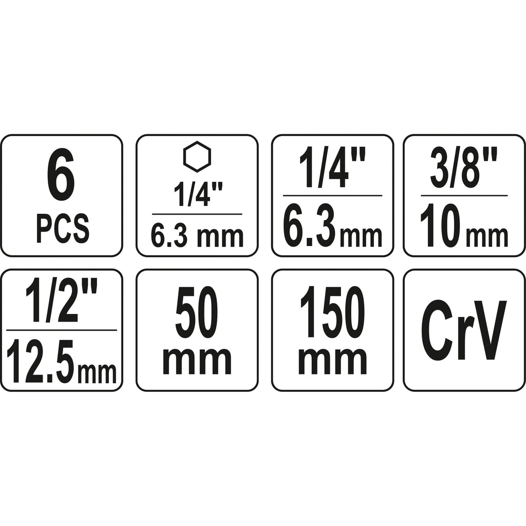 Adaptador Socket vástago hexagonal extensión Juego 6 pcs 1/4'''', 3/8'''' y 1/2'''' 50 y150 mm largo