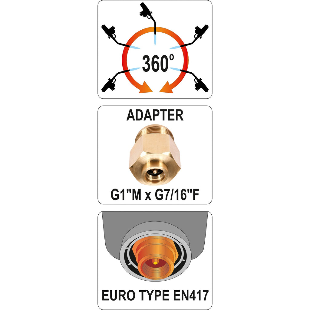 MÁXIMA DE LLAMA 2800 CELS. GRADOS; TEMPERATURA MÁXIMA DE SOLDADURA: POR ENCIMA DE 1300 CELS. GRADOS; TODO EL CUERPO DE LATÓN; PRESIÓN DE AIRE 2.59MPA (375PSI); ENTRADA DE CALOR NOMINAL: 2,0KW; DIÁMETRO DE SOLDADURA: SOLDADURA SUAVE: MÁX. DIAM.100MM, SOLDADURA FUERTE: MAX.DIAM. 32MM; LUZ DE ENCENDIDO DE ARRANQUE AUTOMÁTICO- PARADA; LA LLAMA EXTINGUE EL FONDO; PERILLA DE AJUSTE DE LLAMA; IGNICIÓN PIEZOELÉCTRICA; RUN-LOCK BOTTOM PARA TRABAJOS CONTINUOS; REMOLINO / BOQUILLA TURBO; ROSCA DE ENTRADA: G1 ''''F; INCLUYE ADAPTADOR: G1 ''''M X G7/ 16''''F; MAP-PRO/ PROPAN; CONSUMO DE COMBUSTIBLE: 142G / H; APLICACIÓN: SOLDADURA FUERTE DE TUBOS DE LATÓN DE HASTA 22 MM, TRATAMIENTO TÉRMICO, SOLDADURA DE GRAN DIÁMETRO, SOLDADURA LIGERA
