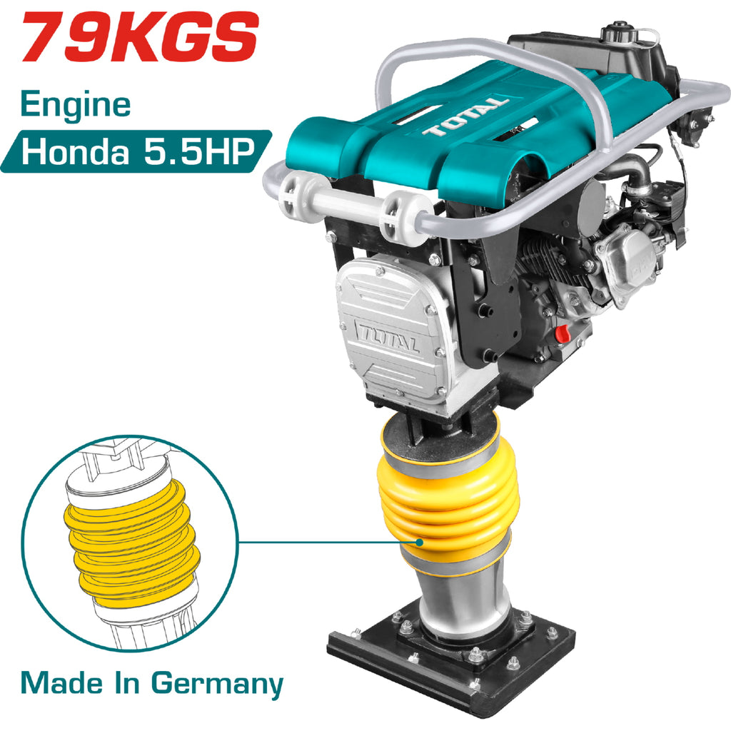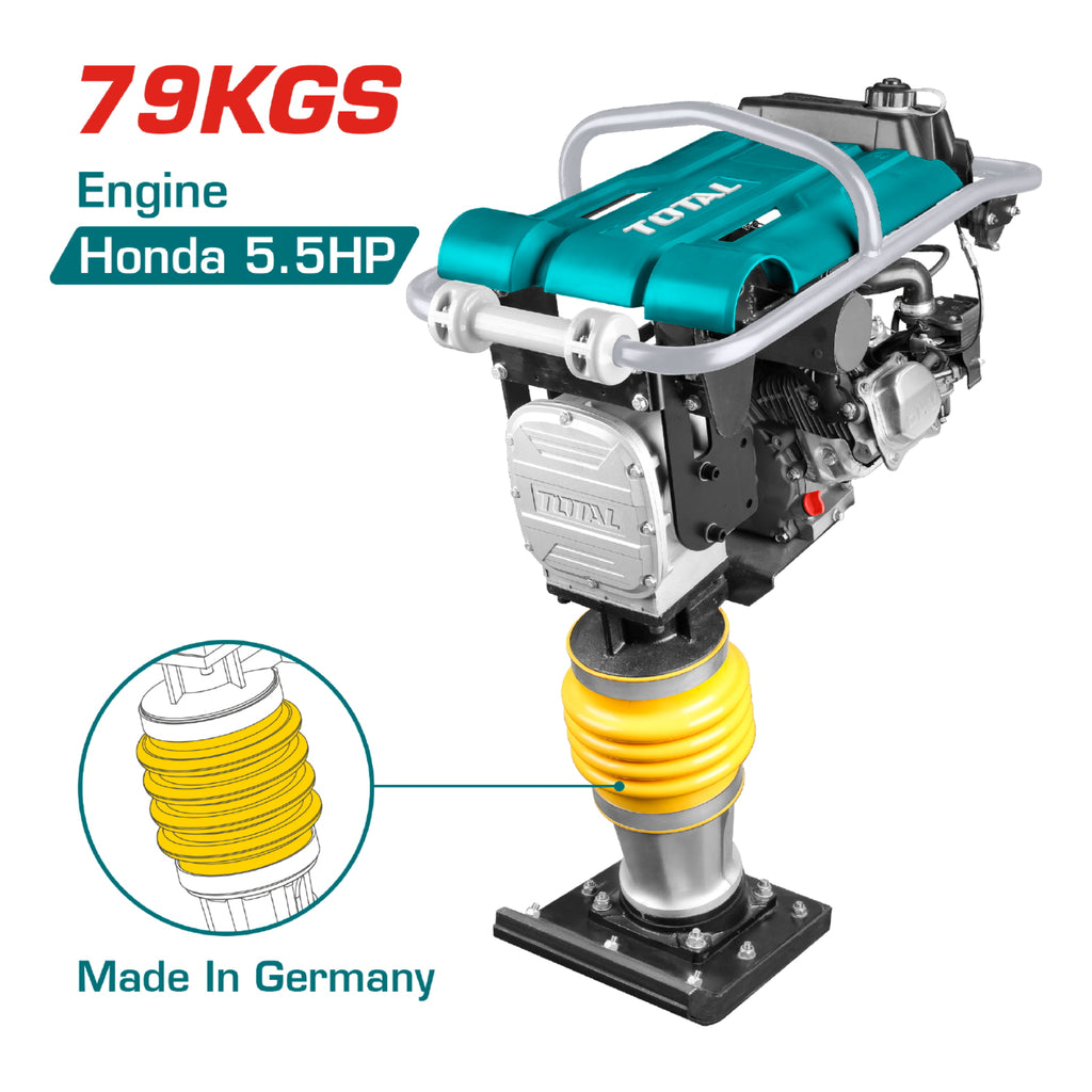Sapo apisonadora compactadora, a gasolina. Motor HondaGX160 4.0Kw (5.5HP) 79 kg. Fuerza de impacto 10KN. Tanque de 2lt.