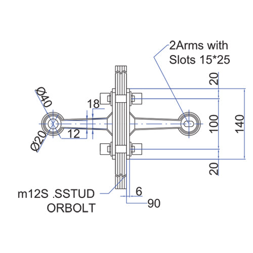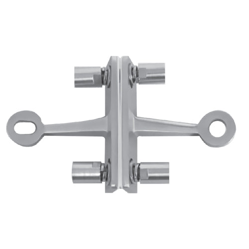 Araña de 2 vias con aleta. No incluye pernos. Satinado. Para construcción de fachadas de vidrio. Construidas a base de acero inoxidable 304 para vidrios de 8 a 26 mm de espesor. Compatible con los pernos para anclaje F/T32 , F/T02 y F/T01.