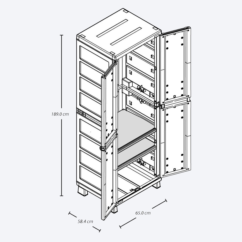 | Características | Armario para Ropa con 2 entrepaños ajustables que resisten hasta 25 Kg cada uno, tubo en aluminio para colgar la ropa, con la profundidad ideal para colgar cómodamente cada prenda. |