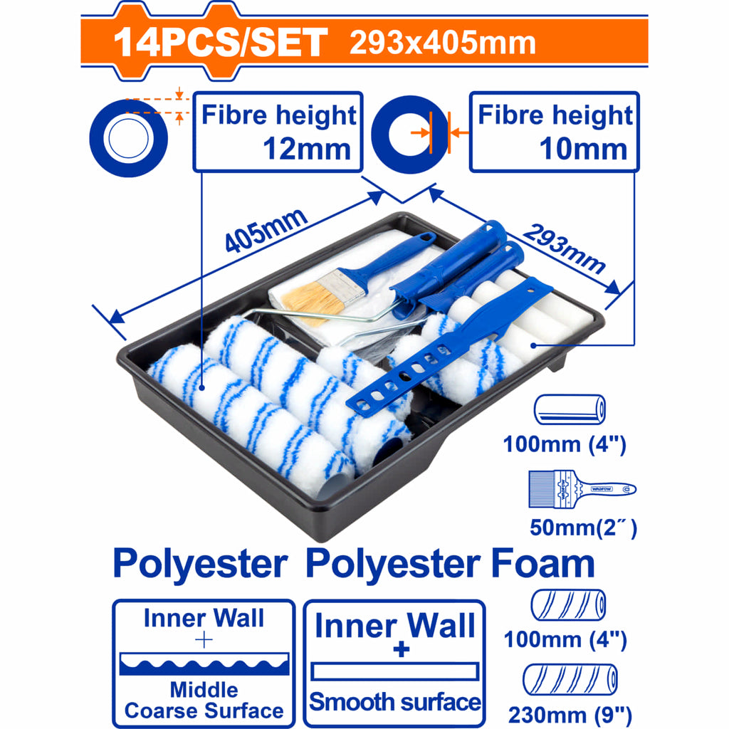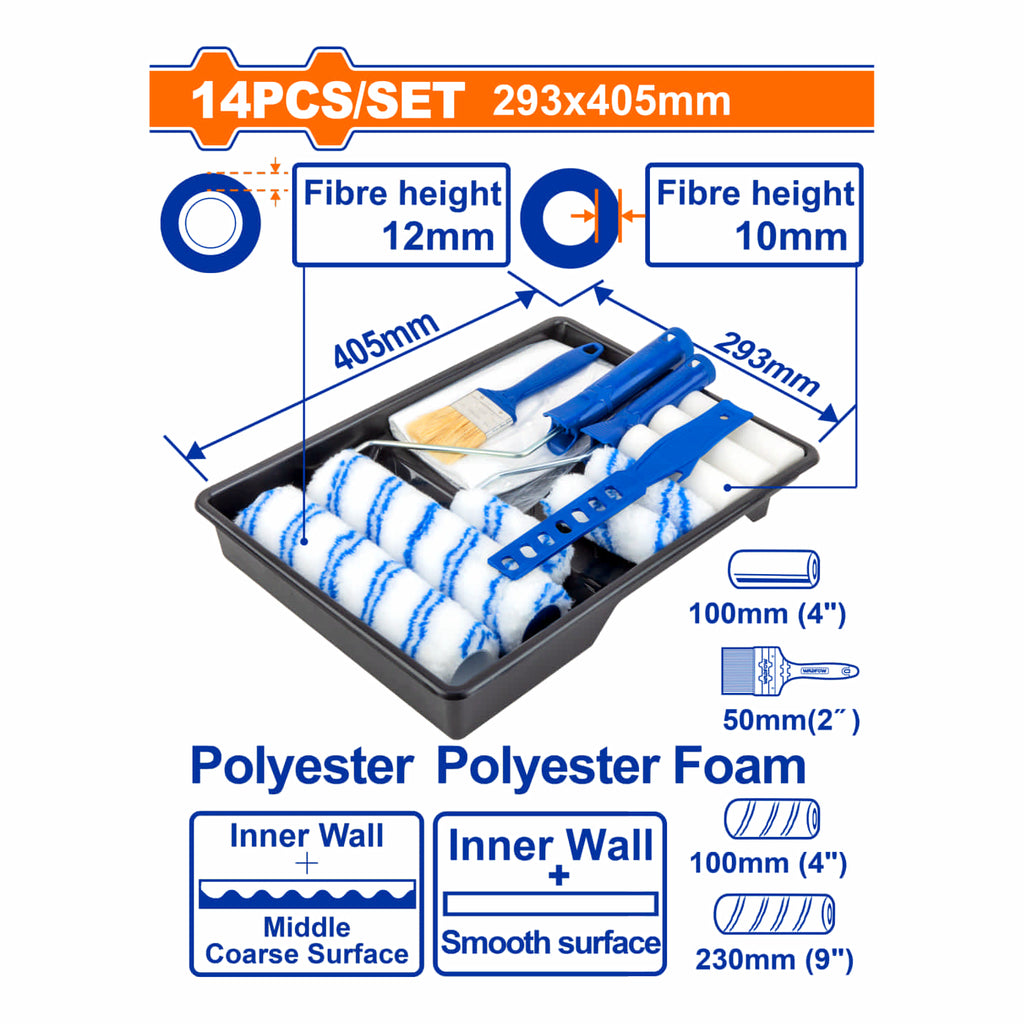 | Características | Rodillos, Brocha y Bandeja para pintar. Set de 14 piezas. Ideal para interiores. Poliéster. El set incluye rodillos, soporte y brocha. |