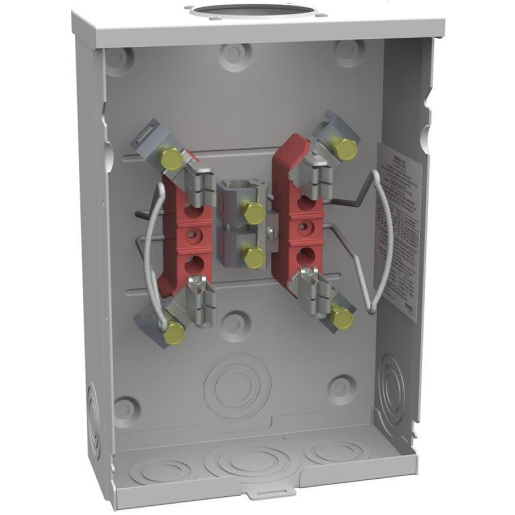 Base Cuadrada para Medidor de Energia. Monofasico. Capacidad Total 125Amp. Para 5 Hilos. 125 - 220 Volt. 60 Hz. Entrada cable de 39 mm. Acero Galvanizado Pintado. Caja Blanca Sticker Codigo Barra