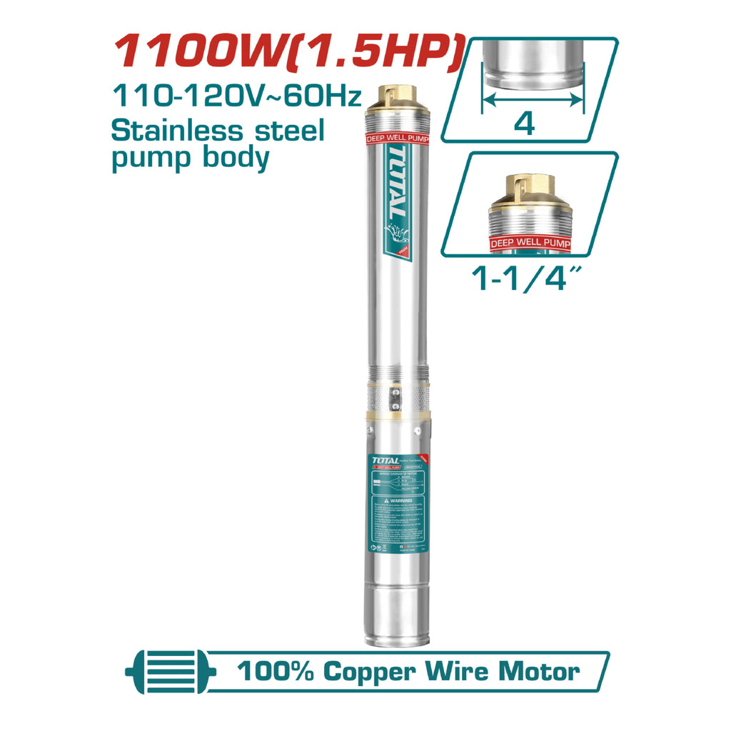 Bomba de pozo cuerpo de 4'' 1100W(1.5HP).(1 año) 110-120V~60Hz.20mts de cable+swiche. NO incluye caja de control. Comprar aparte codigo UTWP511001-SB.