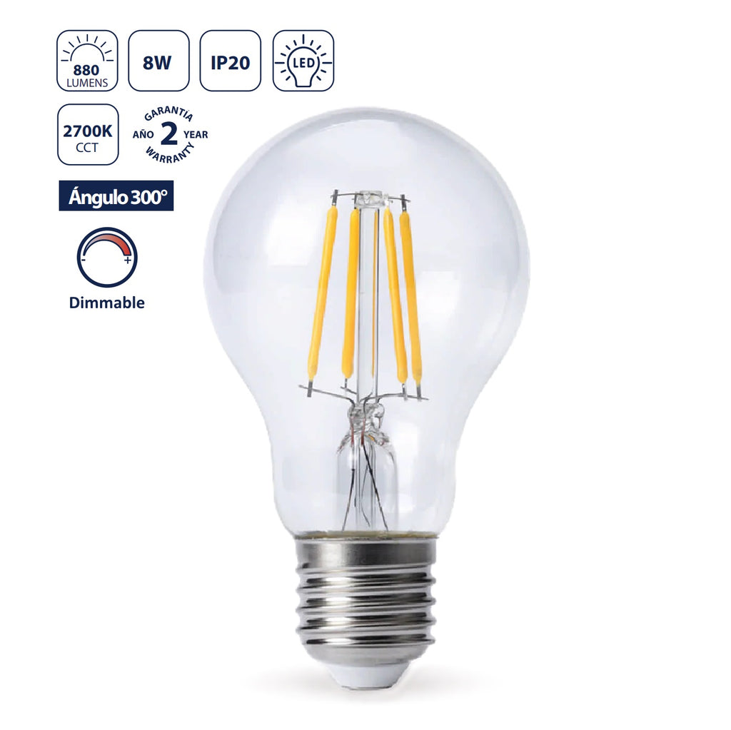 BOMBILLO FILAMENTO LED A19 E27 8W 2700K (luz cálida) con rosca gruesa E27 proporciona un ambiente acogedor, distinguido y diferente, dando un haz de luz homogénea y agradable. Los componentes de gran calidad incorporados en la fabricación permiten tener un Índice de reproducción Cromática(CRI)superior a 80, permitiendo una reproducción de colores muy natural. Elencendido inmediato, la alta eficiencia y su apertura proporcionan un conforte iluminación perfecta. Posee una calidad luminica de 880 y un angolo de 300° con vidrio transparente. Posee un tamaño de 60*108 milimetros. Función de de luz regulable ( se puede ajustar la intensidad de luz)