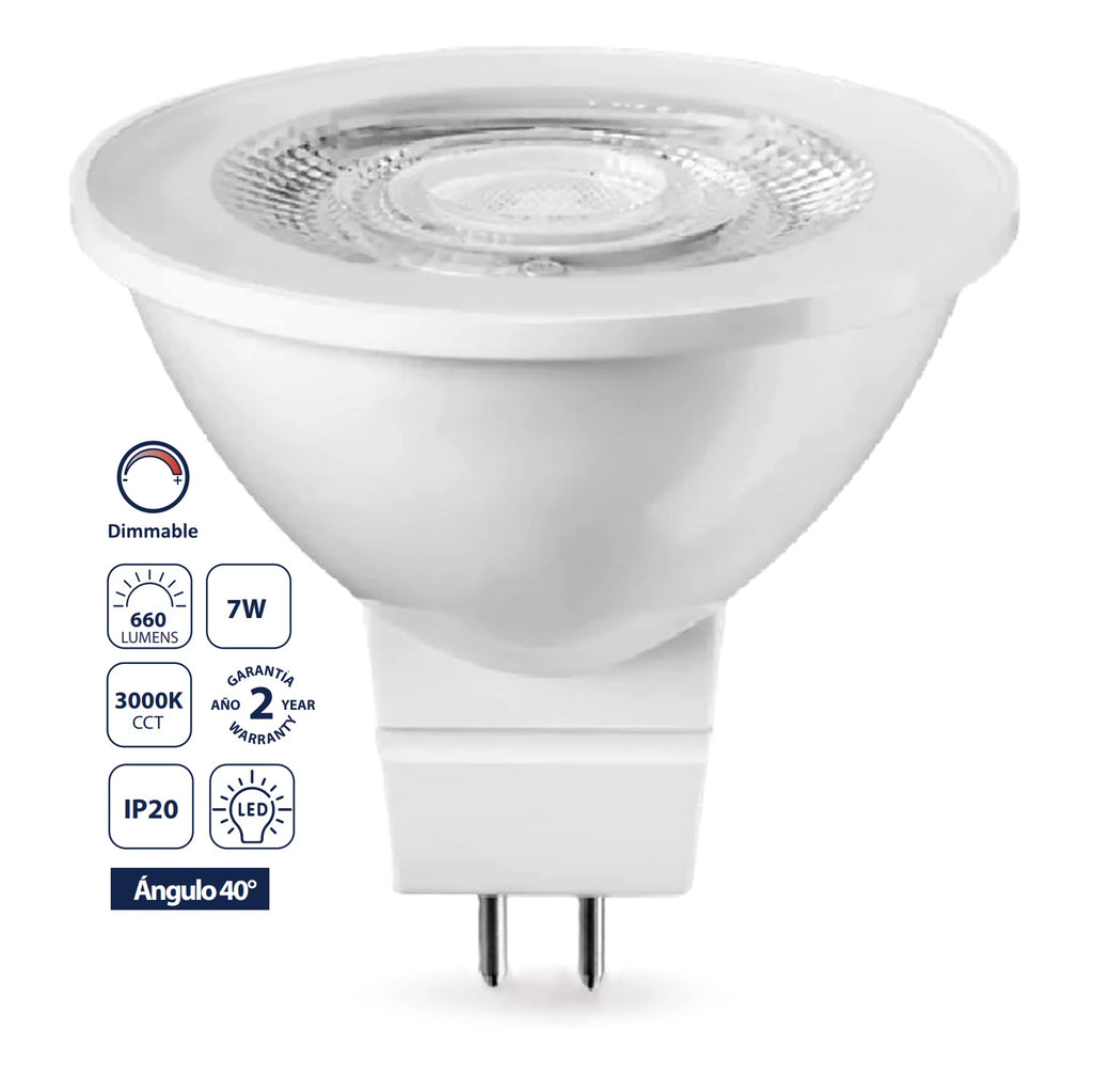 Bombillo LED MR16 GU5.3 Regulable 7W Luz Cálida 3000K 660Lm Equivale Halógena 50W 5X48cm. Foco.