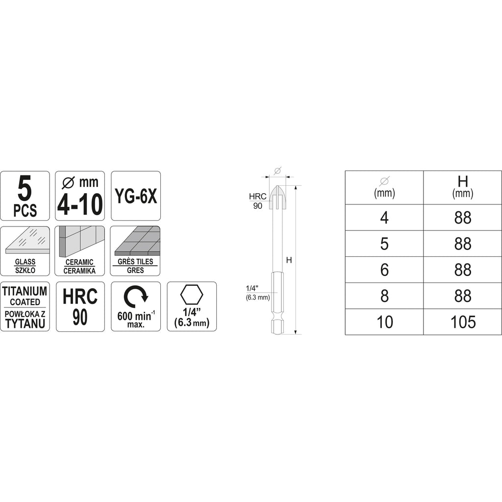TAMAÑO: 4, 5, 6, 8, 10 MM, CON VÁSTAGO HEXAGONAL, MATERIAL: 45 # ACERO AL CARBONO, PUNTA: YG6X, DUREZA DE LA PUNTA: 90HRC Y VÁSTAGO: 38HRC, LONGITUD: 4, 5, 6, 8-88MM, 10-105MM, RECUBIERTO DE ESTAÑO