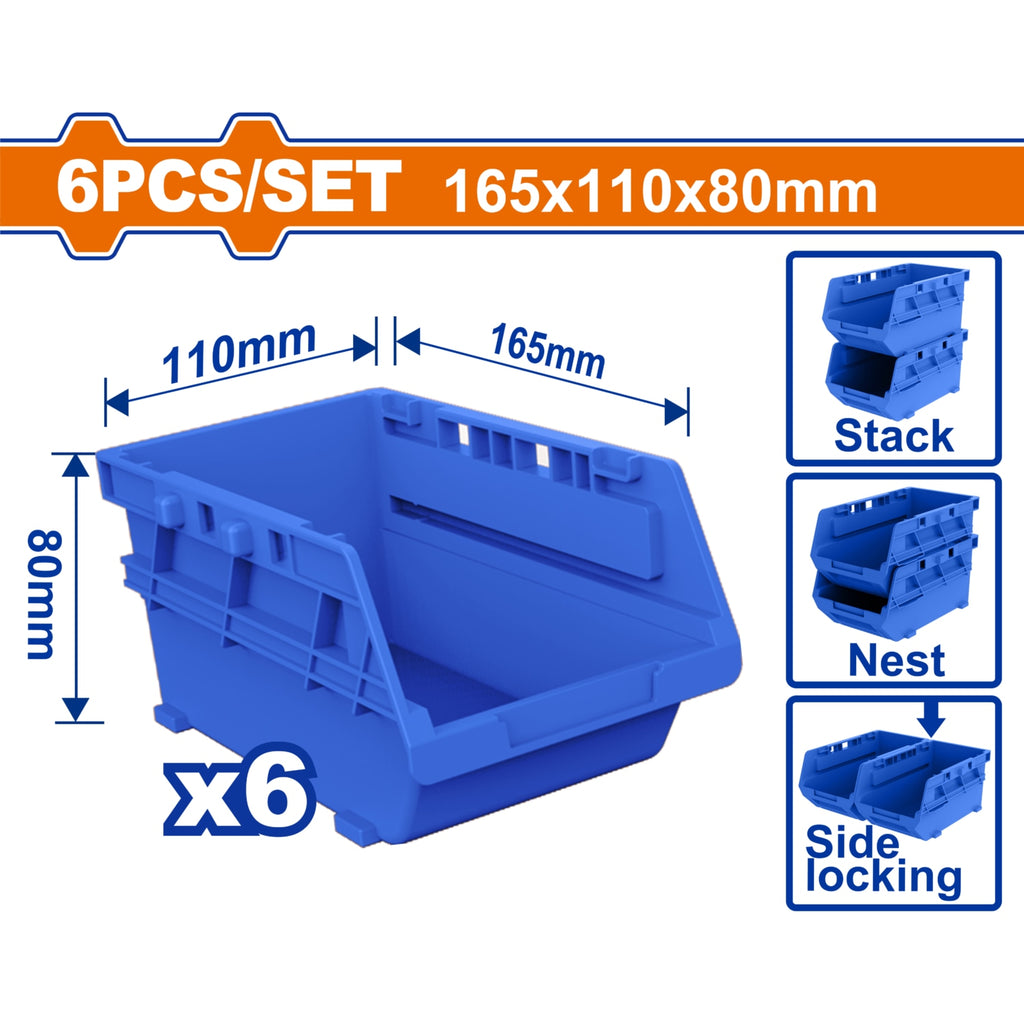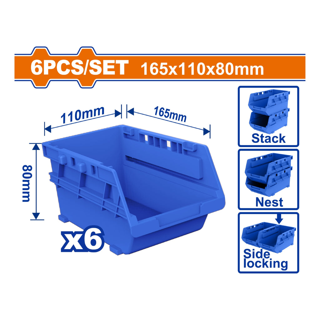 | Características | 165x110x80mm. Set de 6 piezas. Ideal para Encajar, apilar y bloquear lateralmente. Se pueden colgar en pared o en un panel colgante. |