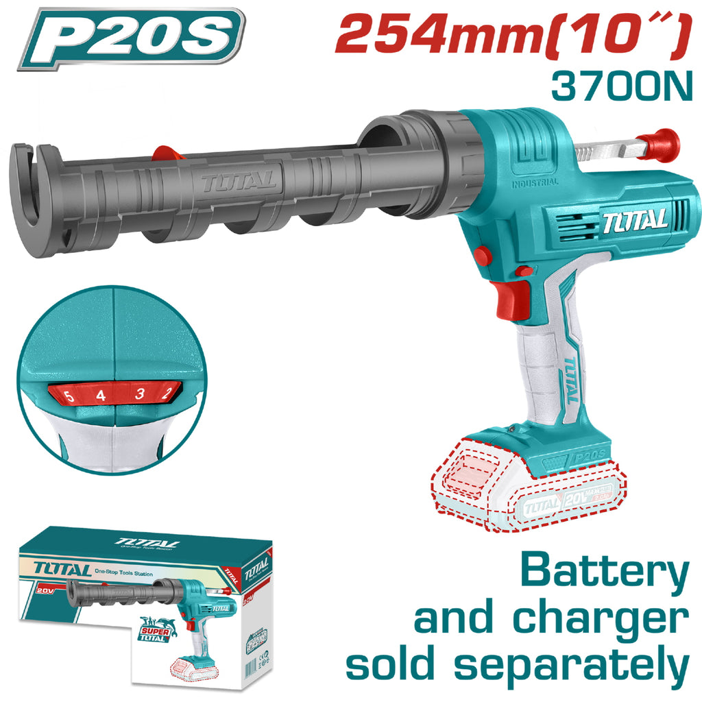 Pistola de silicón inalámbrica 20V, Empuje 2000N, Velocidad de pegado 0.5mm/ s-4.4mm /s, 0.35 A, no incluye batería ni cargador, Caja color.