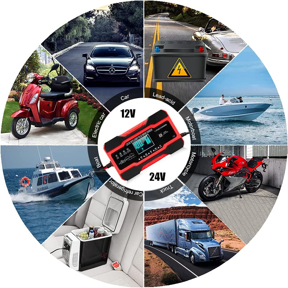 -La velocidad de carga es mucho más rápida que los cargadores automáticos de 8 amperios o 5 amperios. Carga o repara todas las baterías de plomo ácido de 12 voltios y 24 voltios para automoción, marinas y de ciclo profundo, incluyendo AGM, GEL, SLA, inundadas en coches, camiones, SUV, motocicletas, cortacésped, barcos marinos, etc.