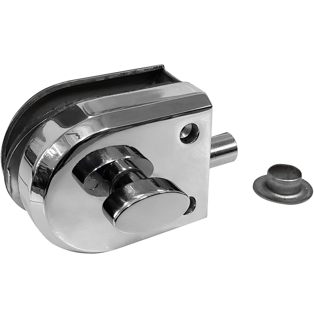 Cerradura sin llaves (pasador) para puertas sencillas. No requiere perforacion en vidrio 8 a 12 mm. Brillante.
