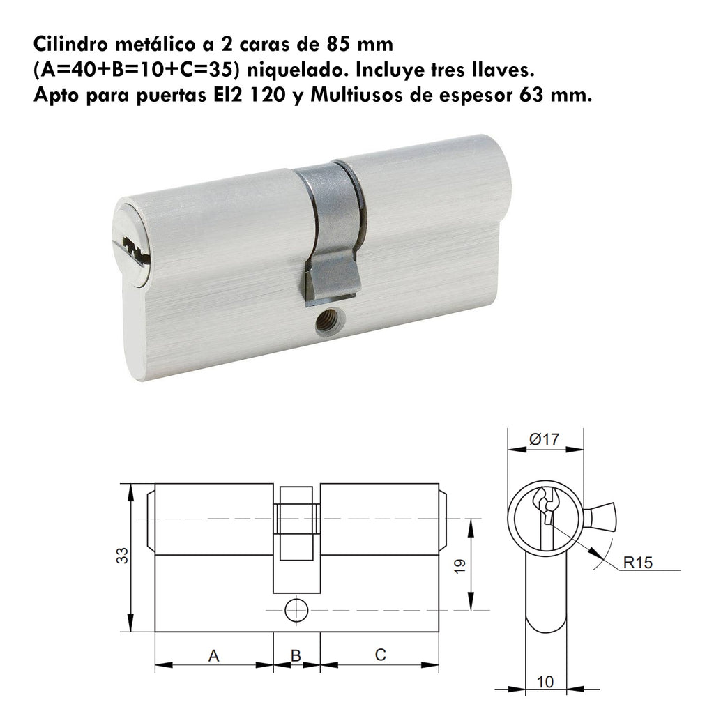 Cilindro Para Puerta Cortafuego C3 De 85 Mm Compatible Con Puertas De 63 Mm Espesor Incluye Tres Llaves.