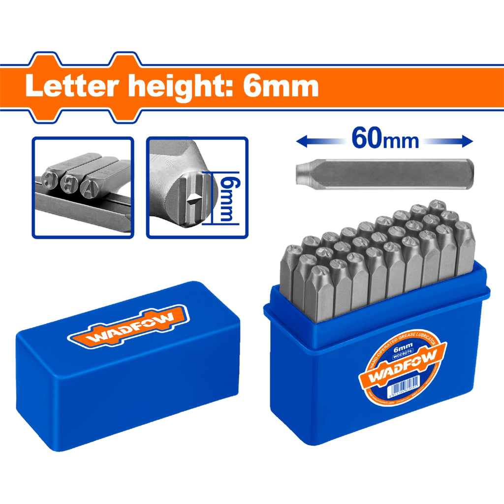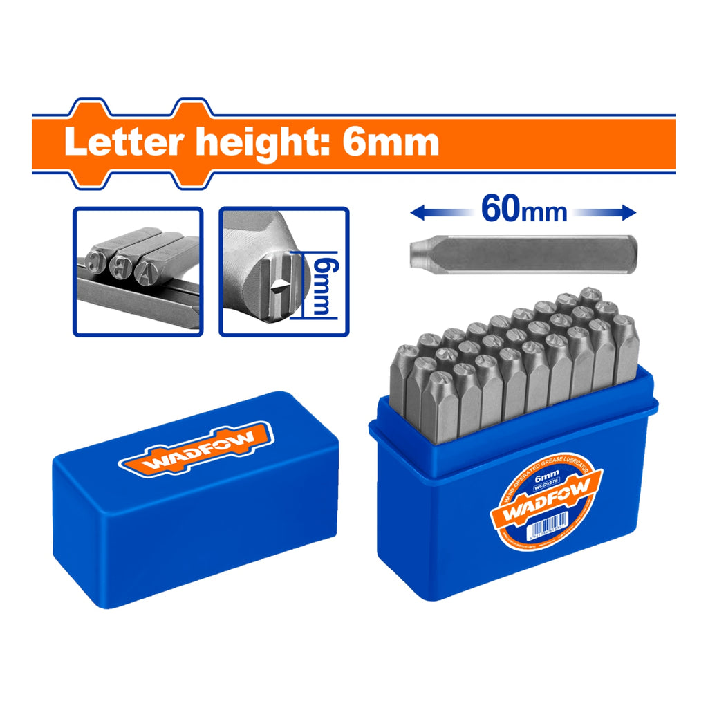 | Características | Cinceles de letras y números Set. 27 piezas. Altura de letra: 6mm. Long: 60mm. Acero al carbono. Incluye: letras de la A a la Z y "&". |