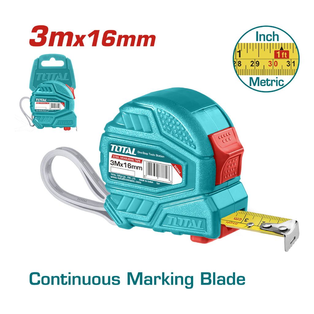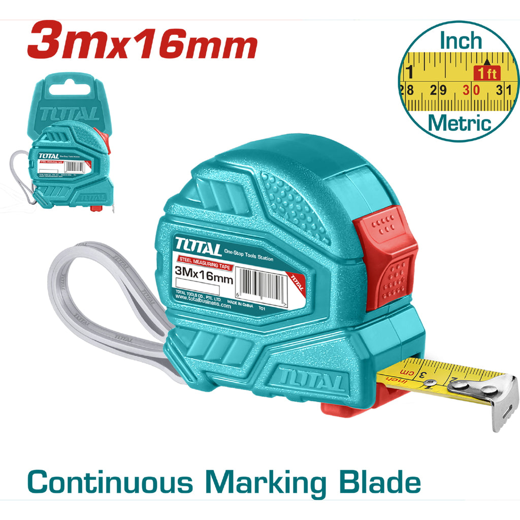Cinta Metrica de Acero de 3 m. Ancho 16 mm. En Métros y Pulgadas. Doble botón. Material de Cubierta ABS. Alta calidad.