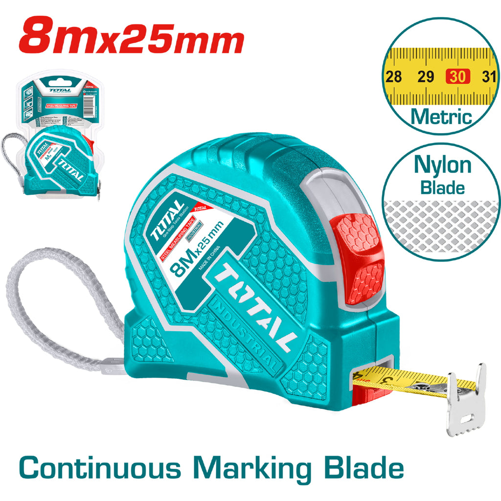 Cinta Métrica de diseño único de navaja de nylon de 8mX25mm. Metros. Con doble botón de autobloqueo. Envoltorio de ABS.