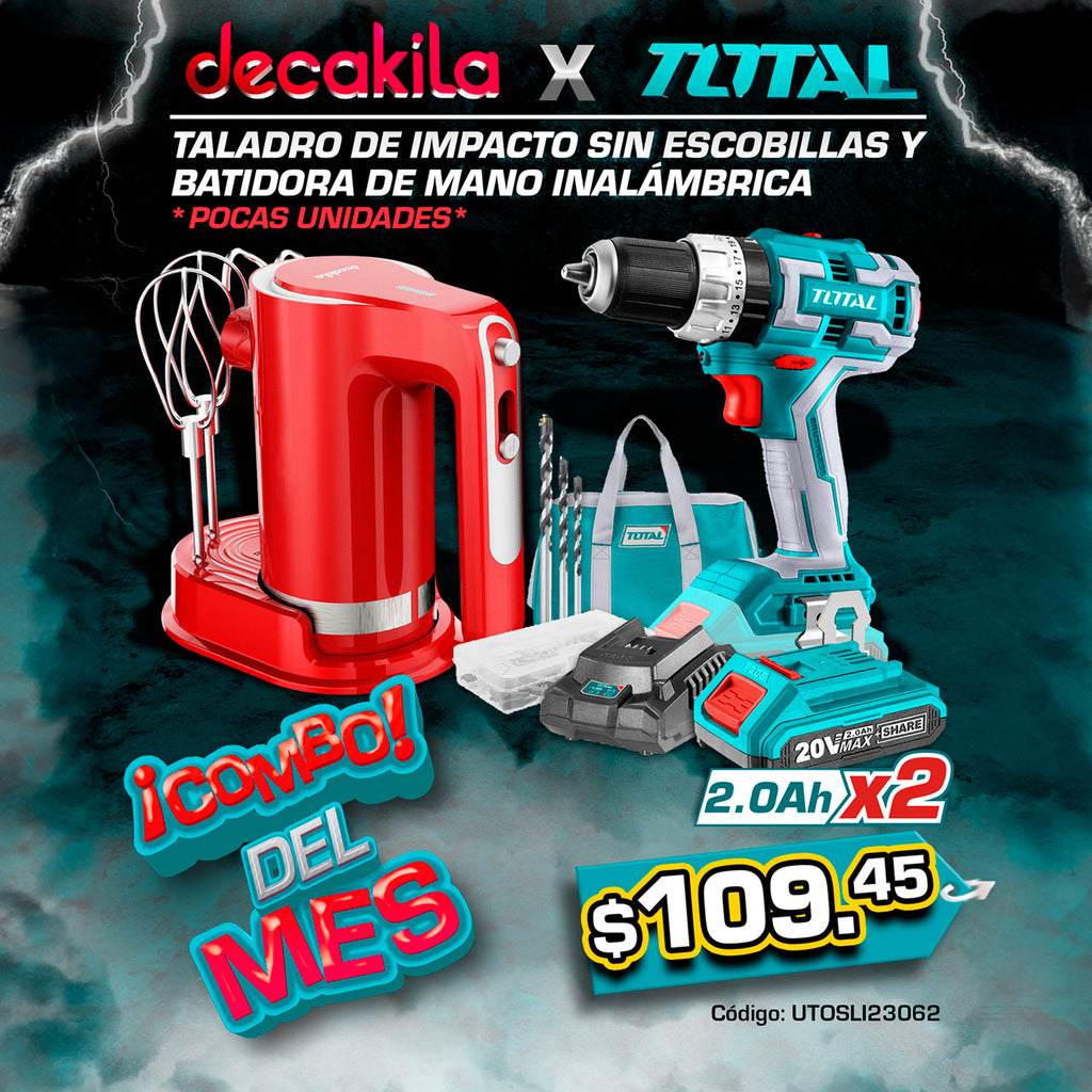| Características | Combo del mes incluye taladro de impacto sin escobillas y batidora de mano inalámbrica |