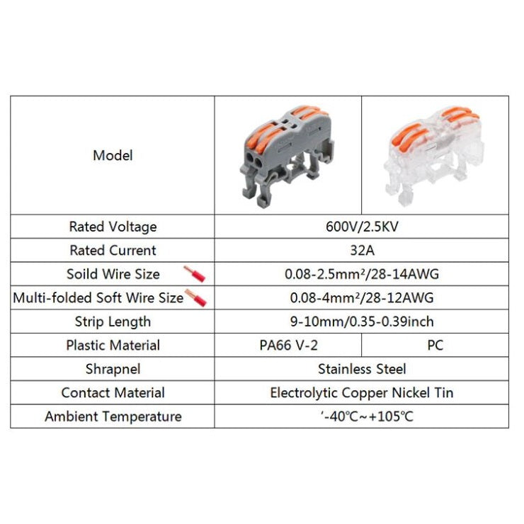 Estos conectores compactos de empalme rápido son pequeños y se pueden reutilizar, lo que ahorra espacio y costos. El diseño patentado, diferente del conector de riel ordinario, no requiere el apretón tedioso de tornillos, simplemente inserte el terminal de carril en la guía DIN de hierro y aluminio de 1.38 pulg, levante el clip naranja, inserte el cable en el agujero hasta que sienta la resistencia, luego baje la palanca naranja y complete la operación, ahorrando el 70% del tiempo de funcionamiento.