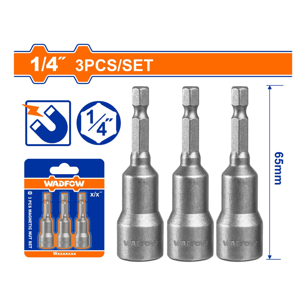 | Características | Tuercas magnéticas 1/4", 3 piezas por juego. Vástago: 1/4" hexagonal. Longitud: 65 mm (2-9/16"). Material: 50BV30. Con imán fuerte. |