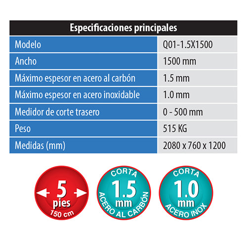 La cizalla manual Q01-1.5X1500 es una máquina de alta calidad para su taller. Posee una hoja de metal que tiene la capacidad de cortar hasta un espesor de 1.5 mm en acero al carbón de hasta 59 pulgadas de ancho por lo que es perfecta para trabajos medianos.