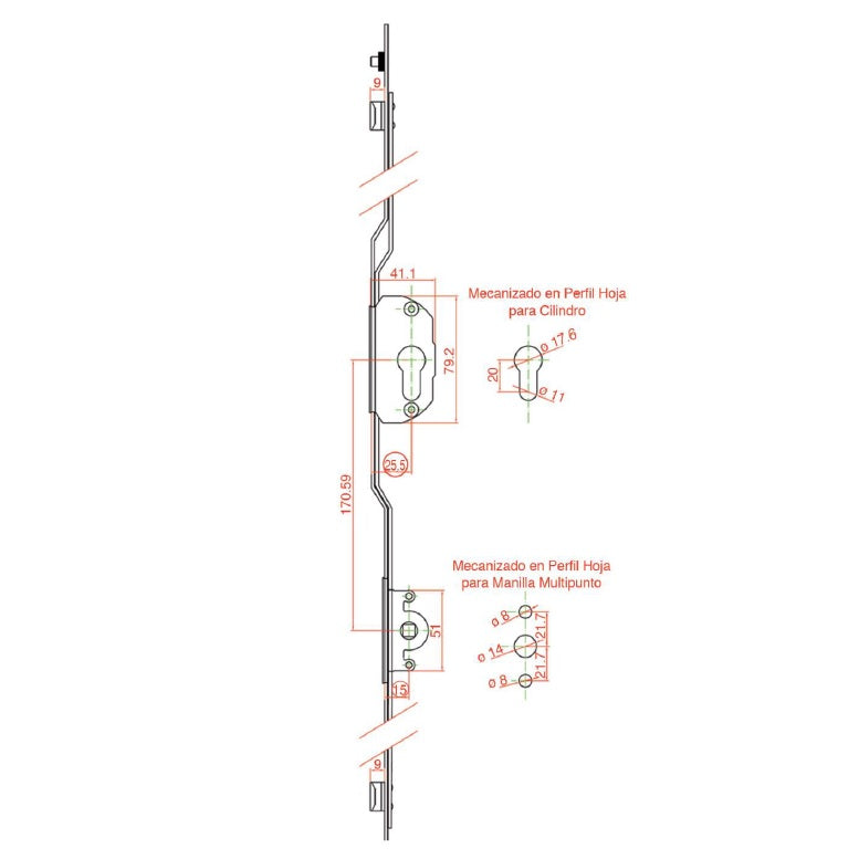 Cuerpo Cierre Multipunto. Tope Antivuelco. Tiene 3 punto Cierre. Funcion con Cilindro Europeo. Largo 1600 mm