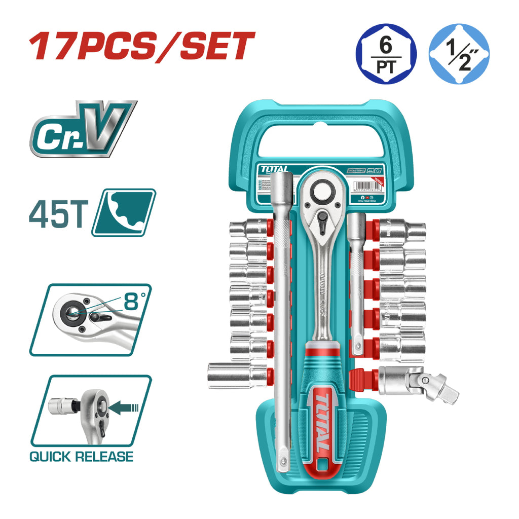 | Características | 1/2" Surtidos y mango socket de liberación rápida. Cr-V. 45T. Set de 17 piezas. |