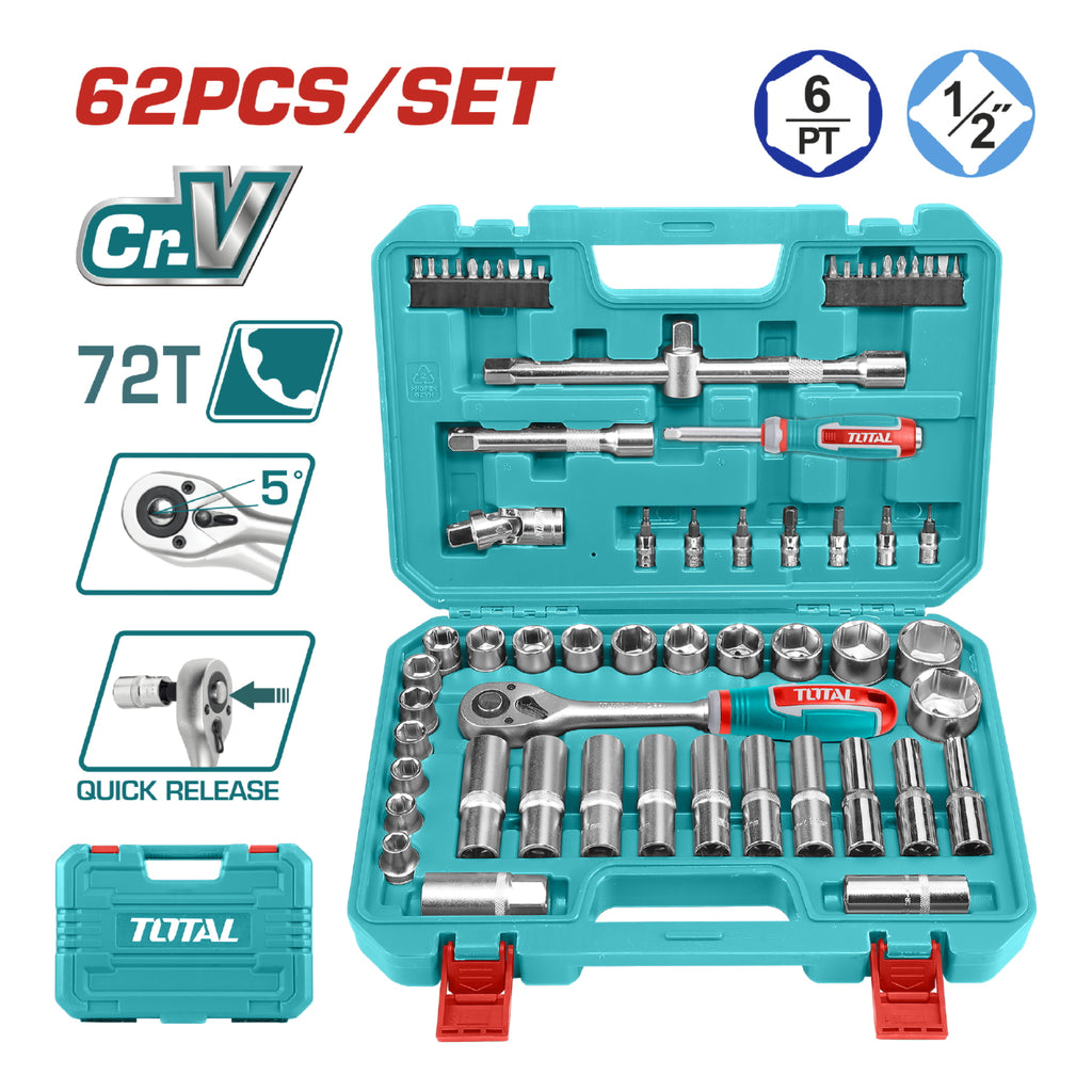 Dados Socket Ratchet Mango Kit 1/2" Cr-V 45T. Set 60 Piezas Variadas En Juego Maletin Kit