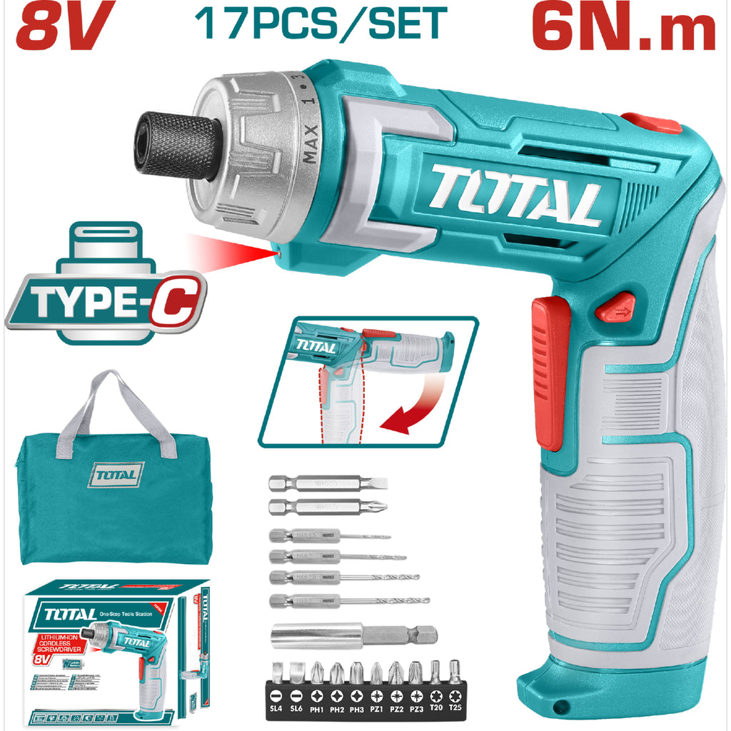 Destornillador Inalámbrico De Litio 8V. Carga USB Cable Tipo C De Celular. 6Nm. Inc.17 Accesorios.