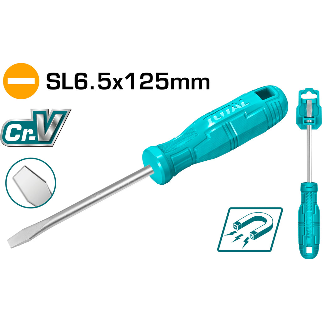 Destornillador Plano 40 Cr, Mango Redondo. Ranura: 6 Mm. Diámetro: 6 Mm. Longitud: 125 Mm