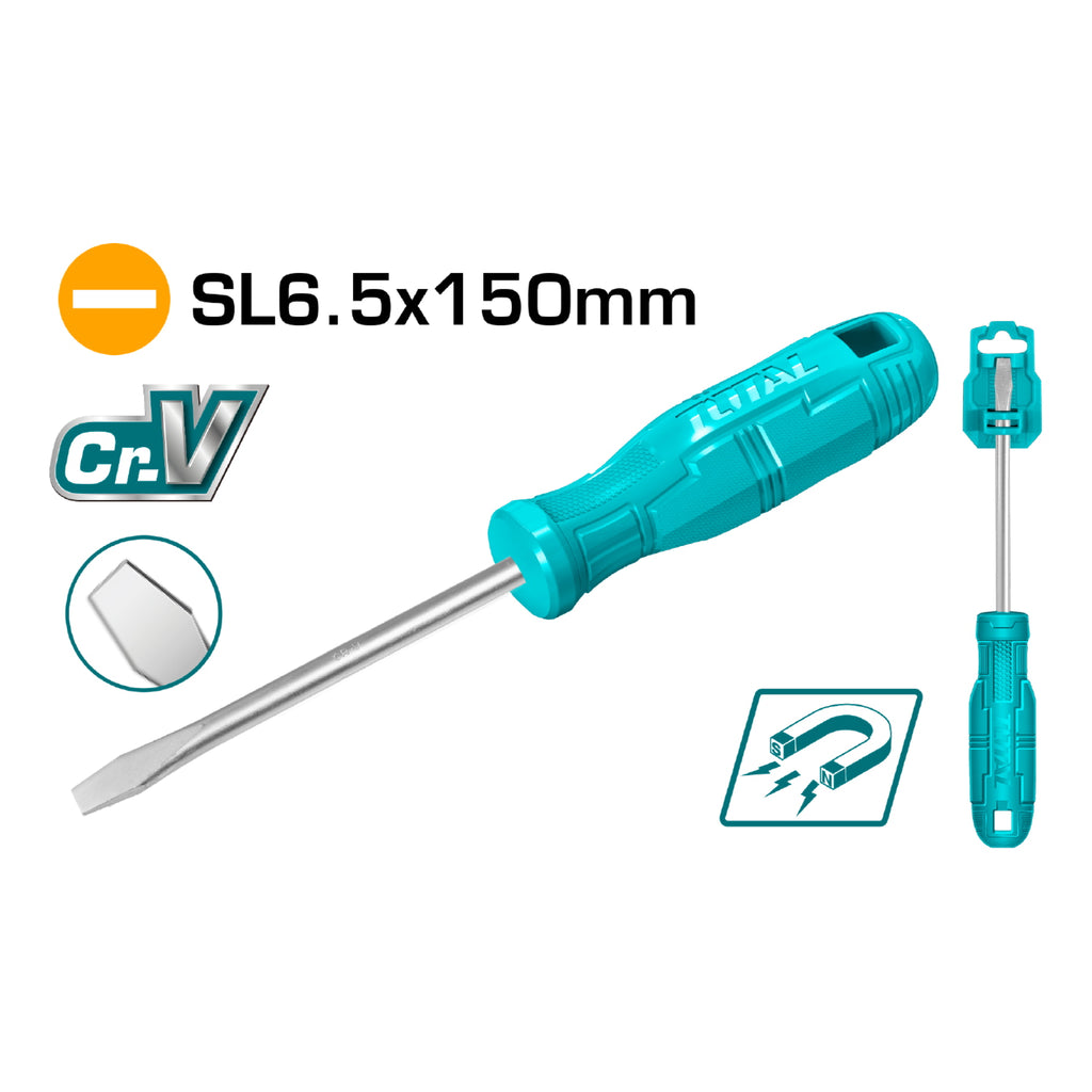 Destornillador plano 40 Cr, mango redondo. Ranura: 6 mm. Diámetro: 6 mm. Longitud: 150 mm