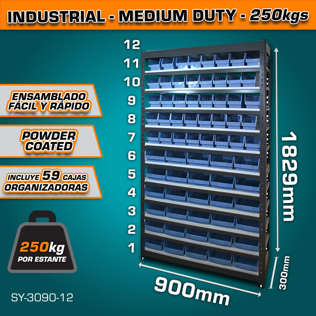 Estante de almacenamiento ajustable 12 niveles con 59 cajas de almacenamiento (41 cajas pequeñas y 18 cajas medianas). 300x900x1829mm. Carga por nivel 250Kg.Estanteria Arma rápido Rack