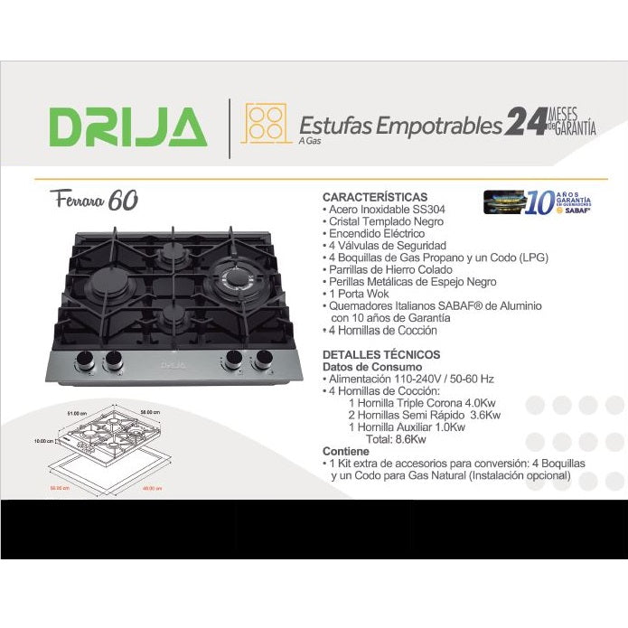 | *Nombre | Estufa a gas, empotrable. Ferrara 60 |