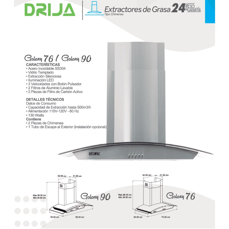 Extractor de Grasa Galaxy 90. Estilo Chimenea, vidrio templado curvo. Luz LED.