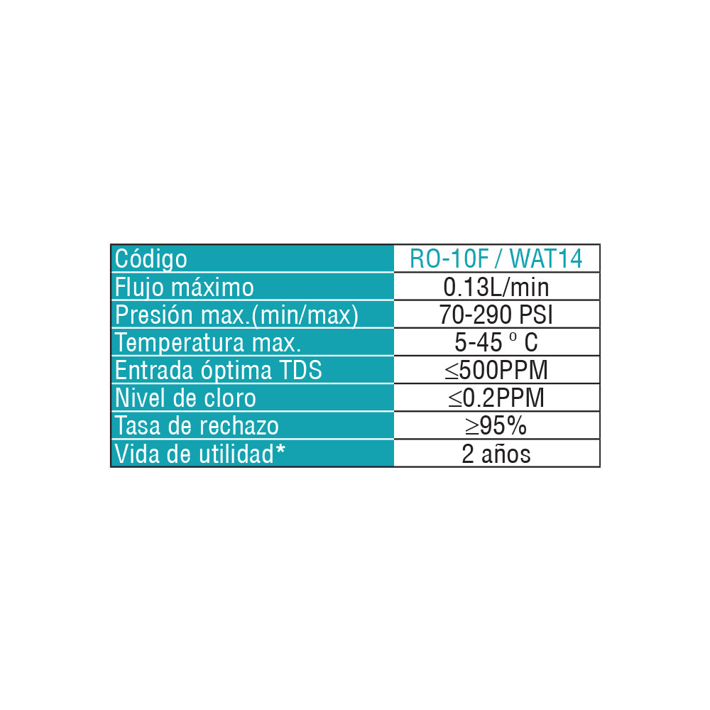 Filtro repuesto RO para Crystal 75 cambiar cada 2 años aproximadamente. Membrana de ósmosis inversa remoción de bacterias, metales pesados, sal, materia disuelta y químicos