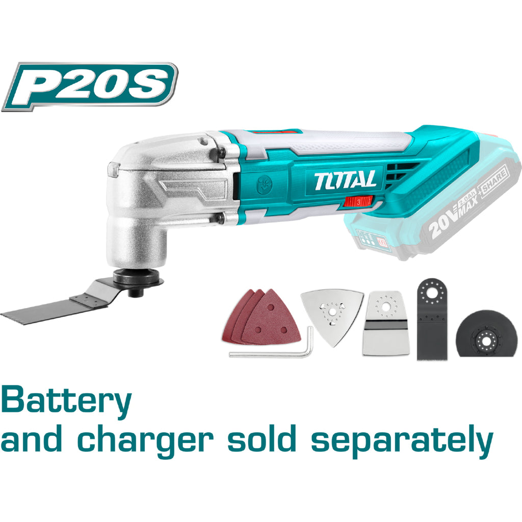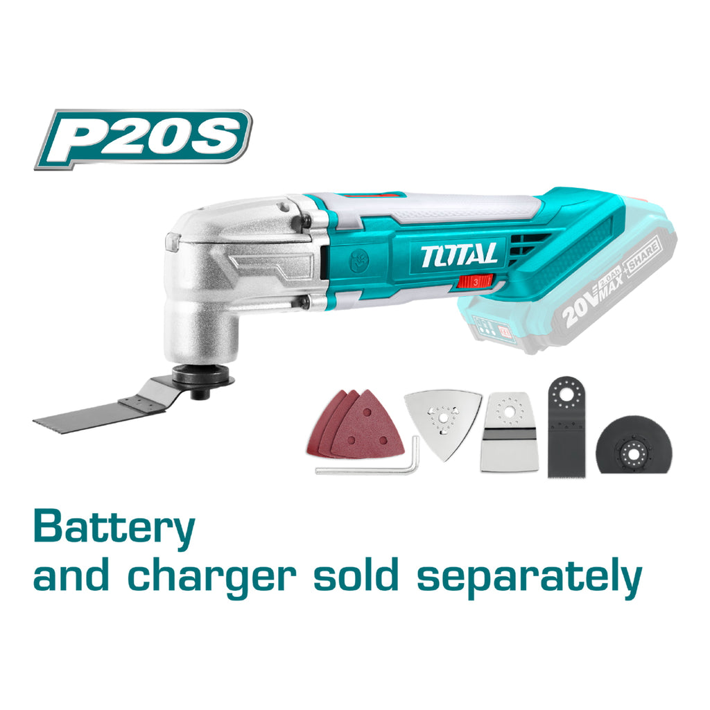 Flexible Multifuncional Litio-Ion de batería de 20 V. No incluye batería ni Cargador. Velocidad Max. sin peso: 5000-20000 rpm. Trae 1 raspador flexible. 1 disco de sierra de corte. 1 disco de sierra segmentada de Corte. 1 llave hexagonal. 1 base de Lijado y 3 pad de lija.
