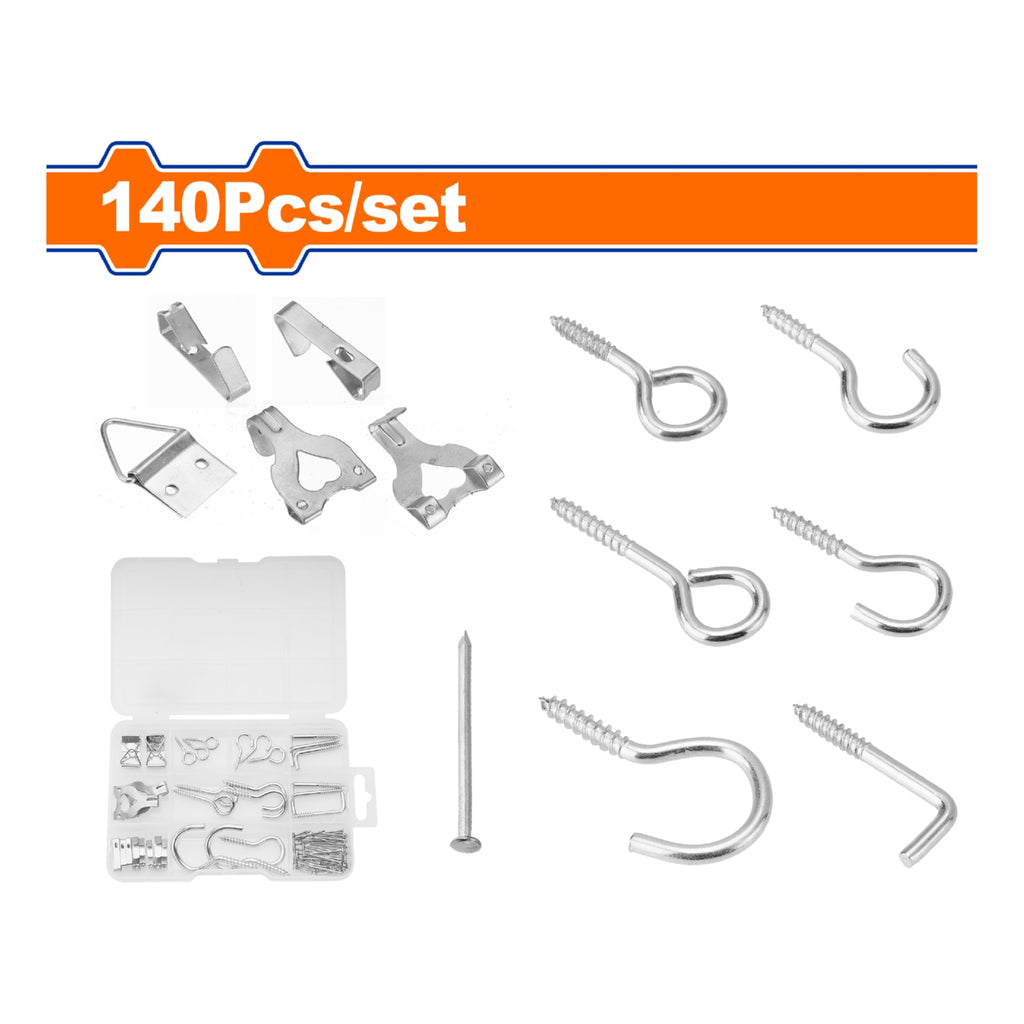 | Características | Ganchos para cuadros, de tornillo, tipo L. 140 piezas. Surtidos. Acero al carbono. Galvanizados. |