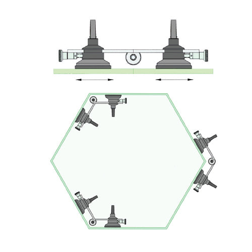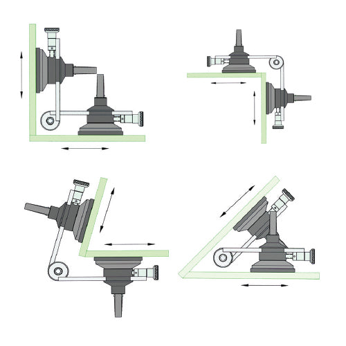 Herramienta de montaje de vidrio multiángulo, sostiene cristales desde fuera o dentro de las superficies, los cristales se pueden fijar en el ángulo deseado y posicionarse para adherirse fácilmente con pegamento UV o adhesivo de silicona, la altura y la posición se puede ajustar (8mm) con las perillas en cada brazo. Diámetro de la copa Ø60mm. Sostiene paneles de vidrio con firmeza hasta que se pegan el uno al otro de manera precisa. Ajustable entre 60º a 240º grados.