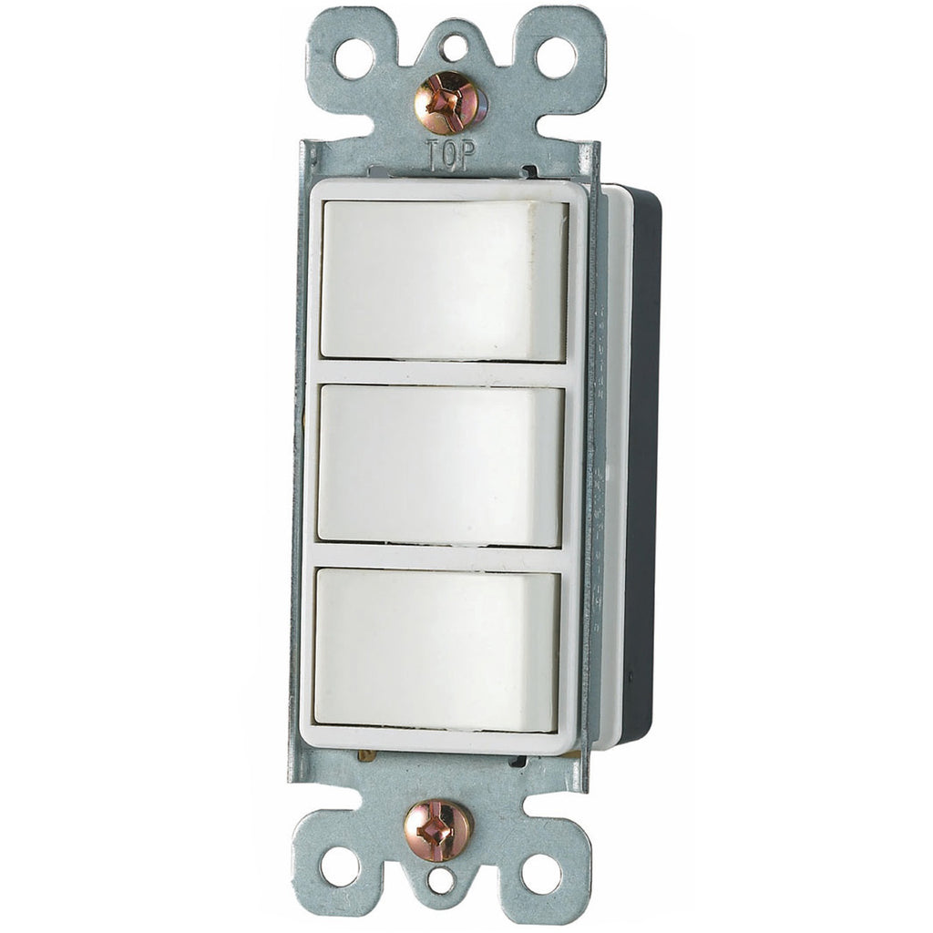 Interruptor Decorativo Triple de 1 Via. 2 Polos/3Wire. 15A-125Volt. 60Hz. Incluye Tornillos. Material Metalico-Plastico-Cobre. Color Blanco. Certificado UL. Empaque Bolsa Plastica Color con Codigo de Barra.