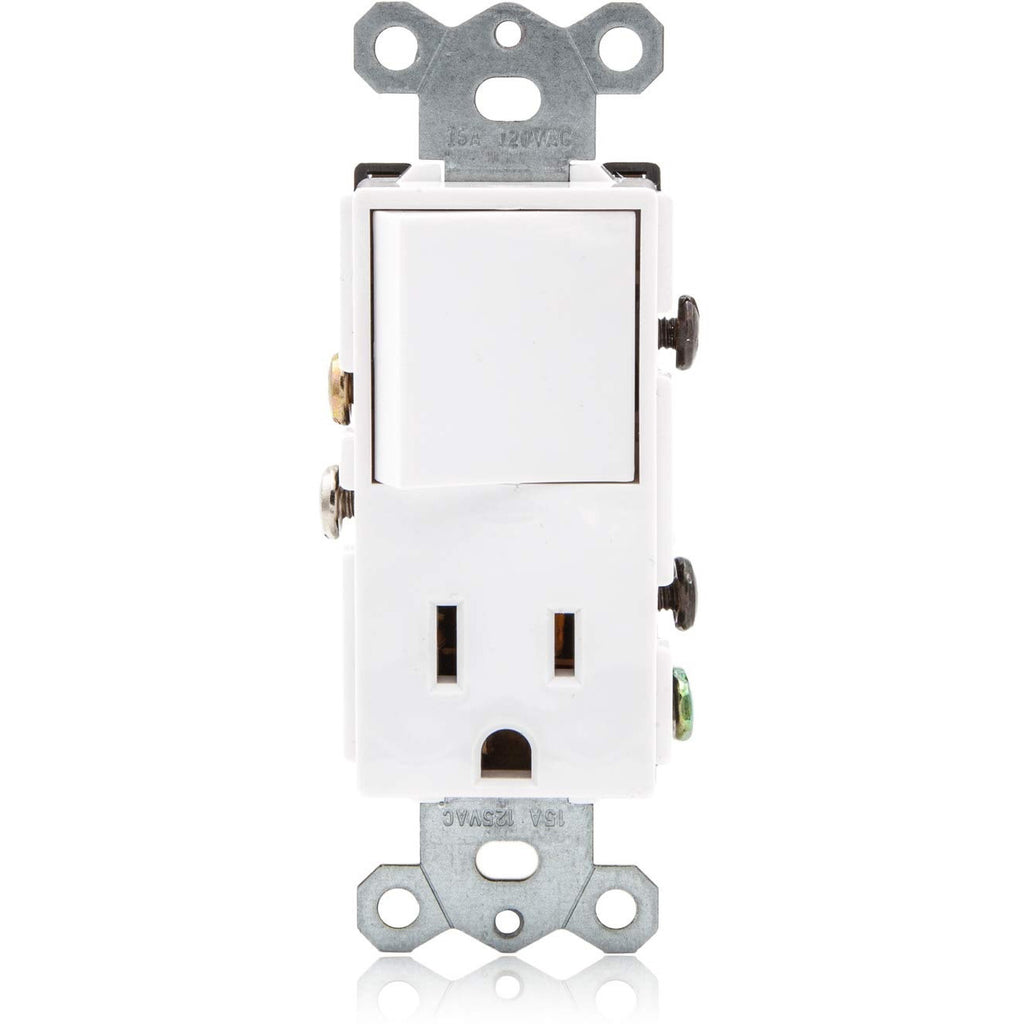Interruptor Decorativo y Tomacorriente de 1 Via. 2 Polos/3Wire. Nema 5-15R. 15A-125Volt. 60Hz. Incluye Tornillos. Material Metalico-Plastico-Cobre. Color Blanco. Empaque Bolsa Plastica Color con Codigo de Barra.