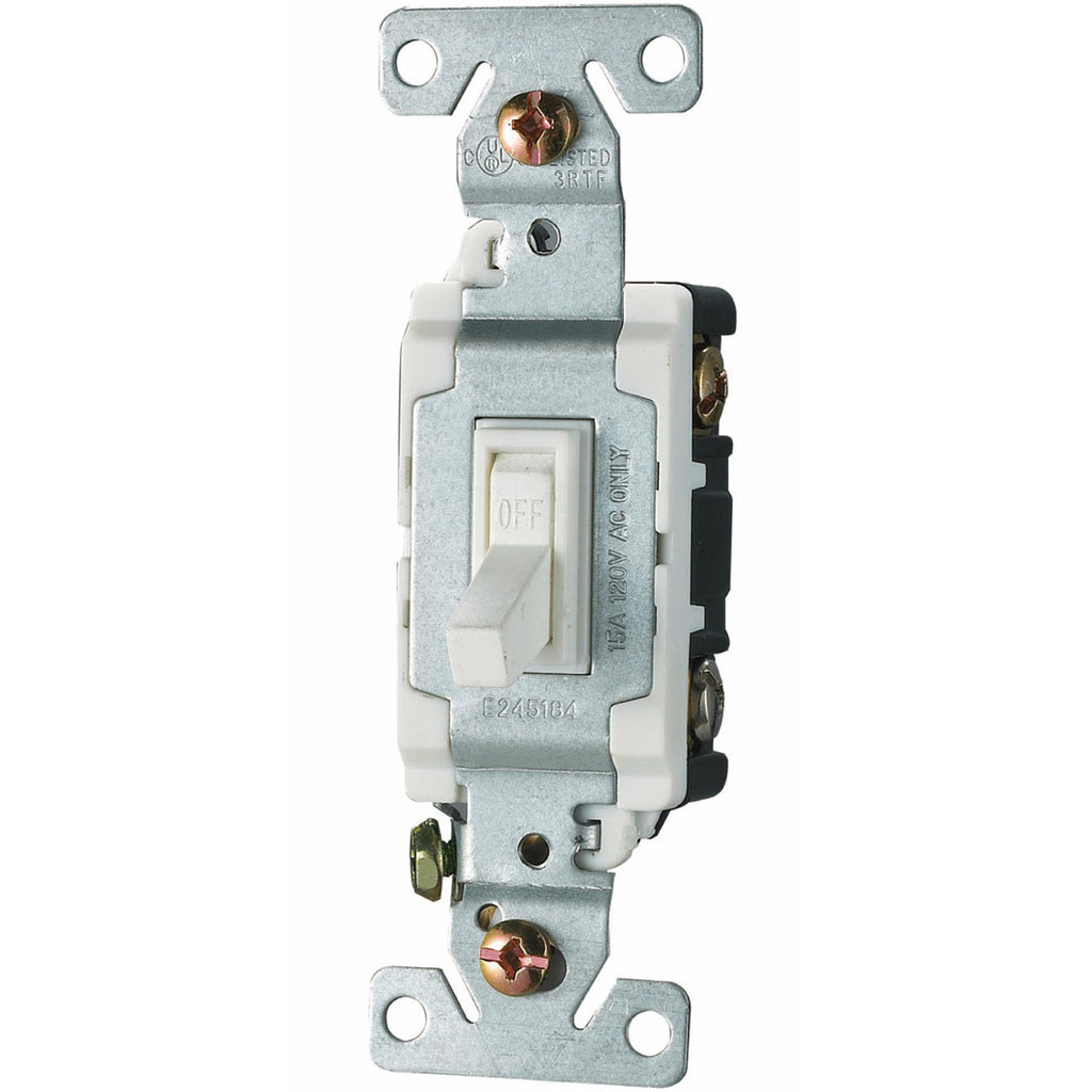Interruptor Sencillo de 3 Vias. 2 Polos/3Wire. 15A-125Volt. 60Hz. Incluye Tornillos. Material Metalico-Plastico-Cobre. Color Blanco. Certificado UL. Empaque Bolsa Plastica Color con Codigo de Barra.