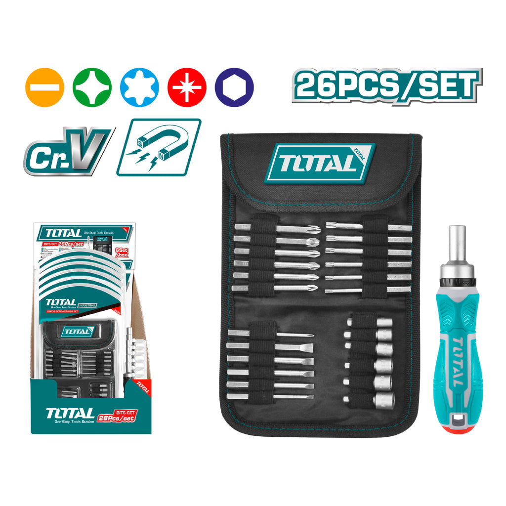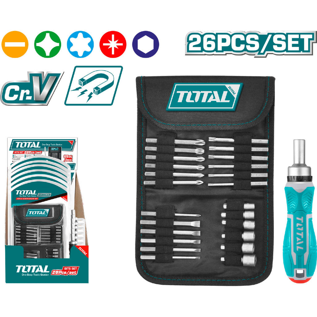 Juego 26pza Destornillador ratchet de puntas.18pcs 65mm Screwdriver bit 6pcs Power sleeve Material:CR-V