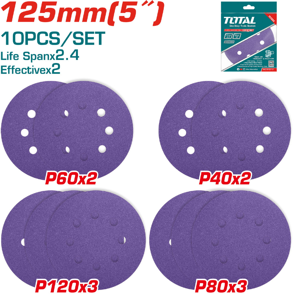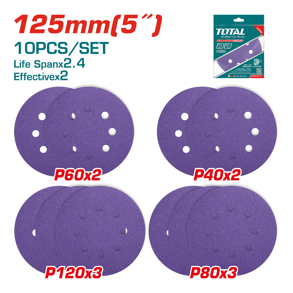 Juego De 10 Discos De Lija Para Lijadora De 5" 125Mm. P40x2 P60x2 P80x3 P120x3.