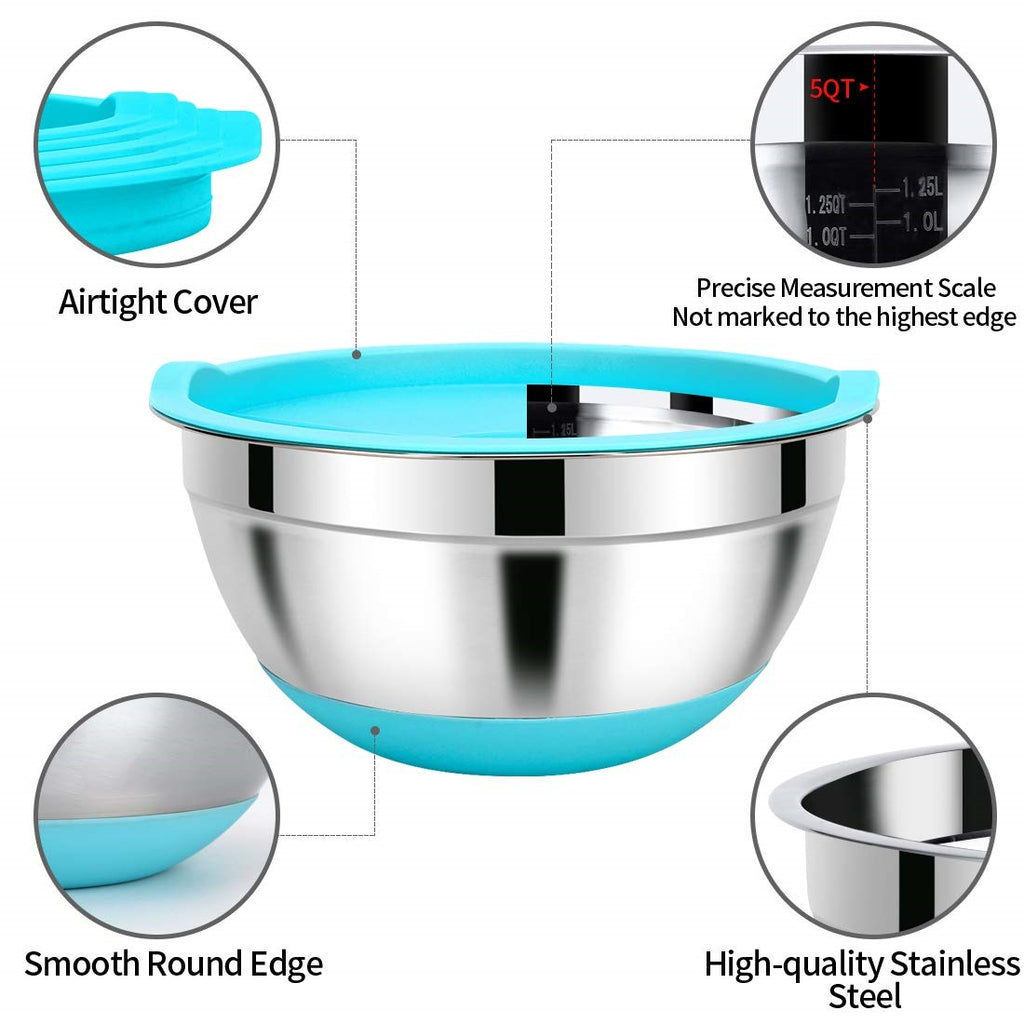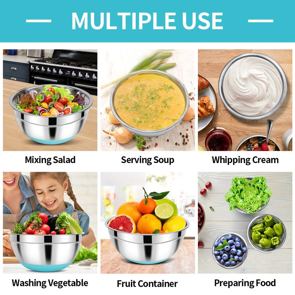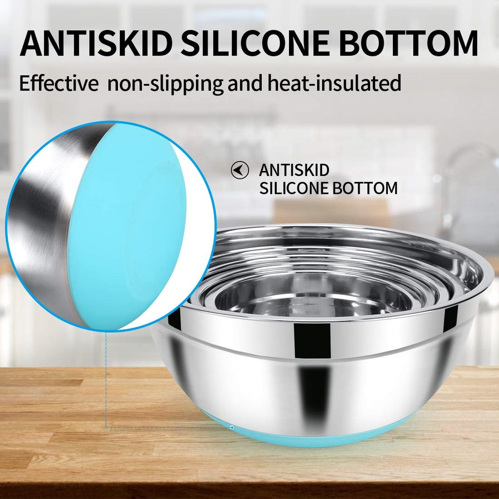 La parte inferior de silicona antideslizante es colorida y antideslizante, evitando que el cuenco se mueva en la encimera, por lo que puedes mezclar fácilmente todos tus ingredientes y alimentos favoritos.