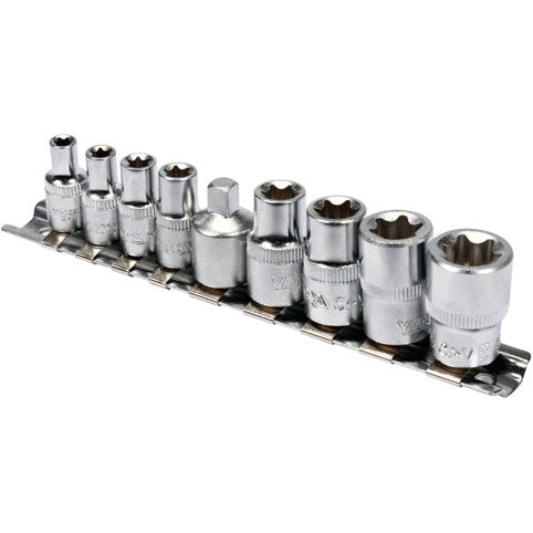 Yato Juego De Dados Torx (E5-E16, 9 Piezas). Contenido: 1/4'': E5, E6, E7, E8; 3/8'': E10, E12, E14, E16, Adaptador: 1/4''(M)X3/8''(H), Material: Crv 50Bv30, Longitud: 25 Mm, Din 2124, Semipulido, Semigranallado, Borde Moleteado En El Centro Juego De Dados