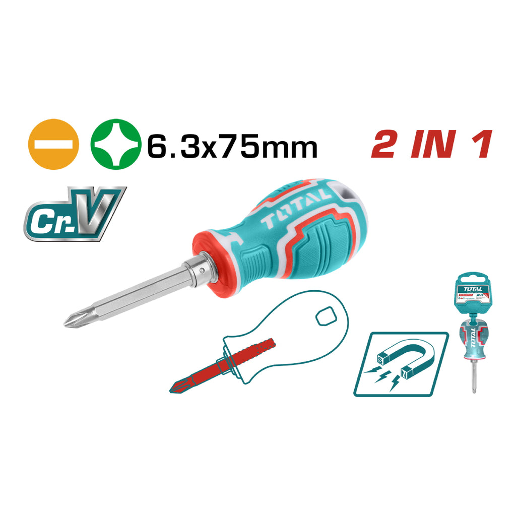Juego de Destornilladores 2 en 1 con Mango Intercambiable. Cr-V. Tamaños de los Vastagos destornilladores: 6.3 x 75 mm.Destornilladores: PH2 + SL6.
