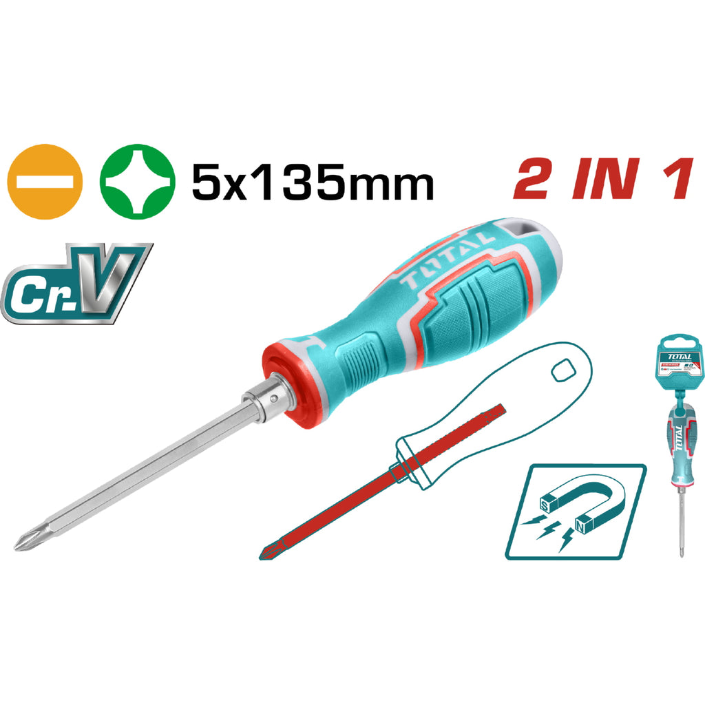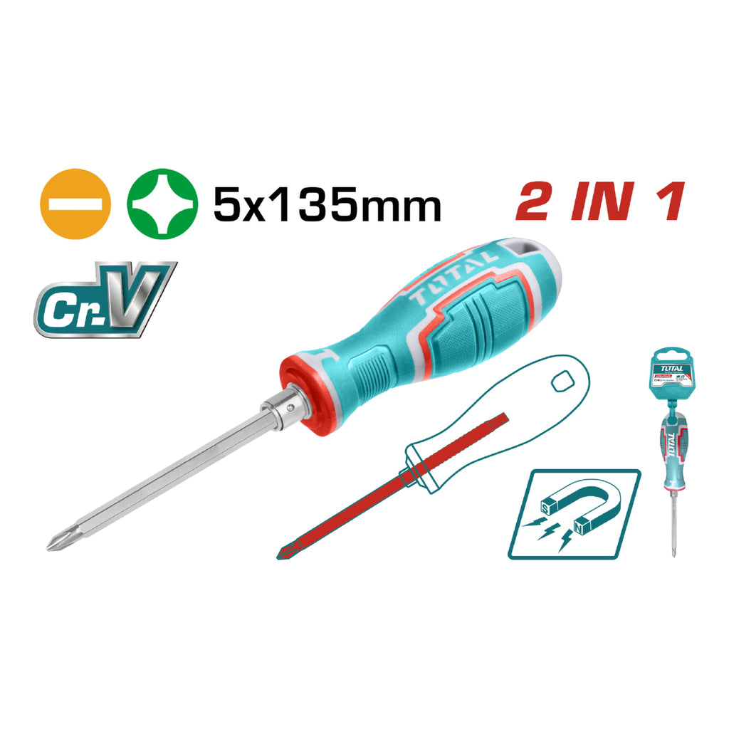 Juego de Destornilladores 2 en 1 con Mango Intercambiable. Cr-V. Tamaños de los Vastagos destornilladores: 5 x 135 mm.Destornilladores: PH1 + SL5.